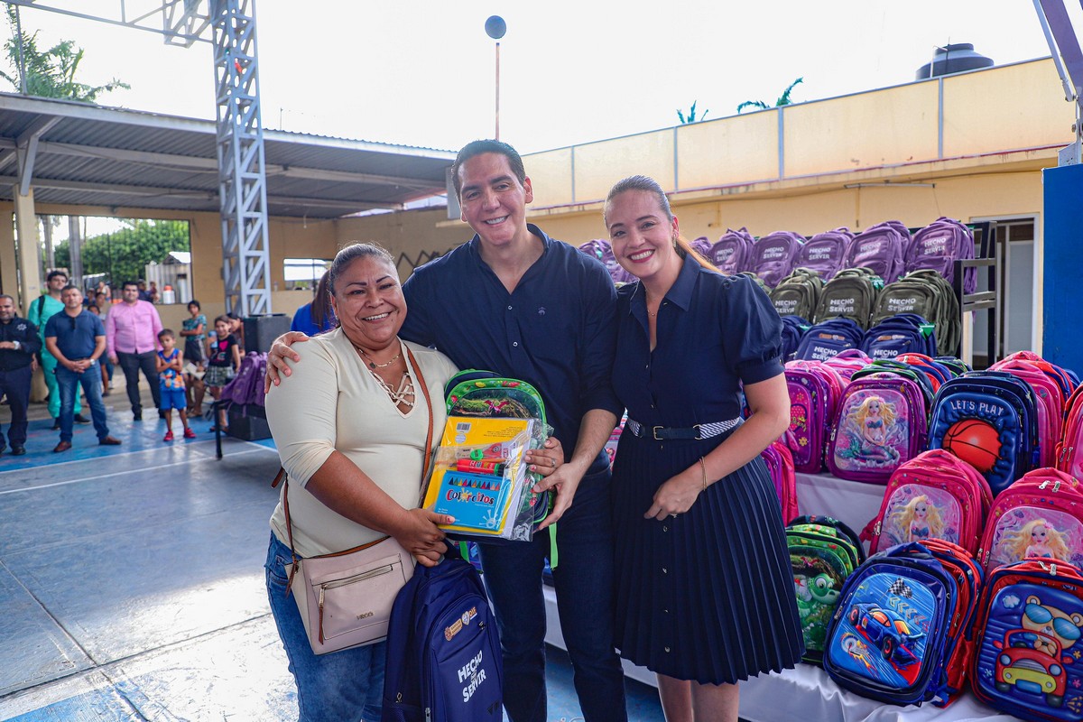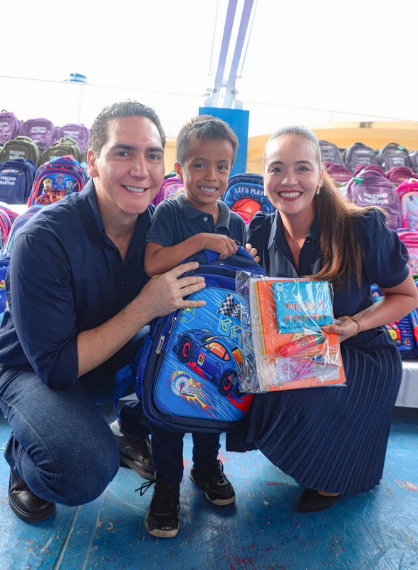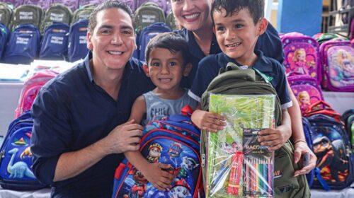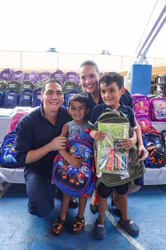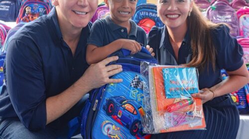 El presidente municipal de Bahía de Banderas, Héctor Santana García, acompañado de su esposa, Margui Zúñiga de Santana, presidenta del Sistema DIF Municipal, encabezaron la entrega de mochilas y útiles escolares en beneficio de niñas y niños de todo el municipio, con el objetivo de apoyar la economía familiar y motivar a los estudiantes en el próximo regreso a clases.