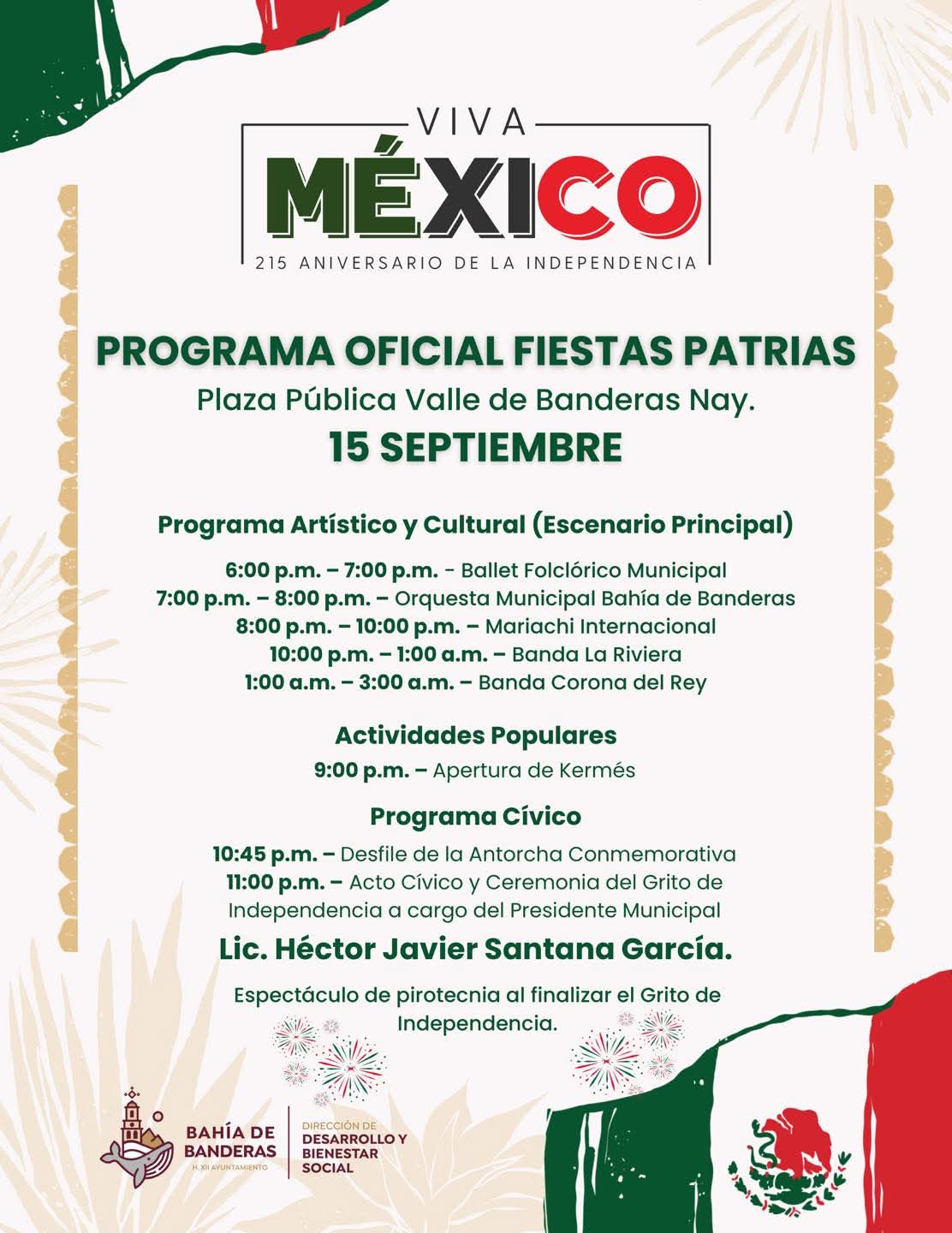 Les reiteramos la invitación a celebrar juntos el 215 Aniversario de la Independencia de México, la cita es el día de mañana 15 de septiembre en la Plaza Pública de Valle de Banderas.