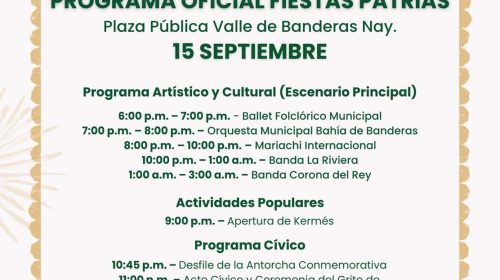 El programa incluirá presentaciones artísticas y culturales, una gran kermés popular, desfile de la antorcha y el acto cívico con la Ceremonia del Grito de Independencia, a cargo del Presidente Municipal, Lic. Héctor Javier Santana García.