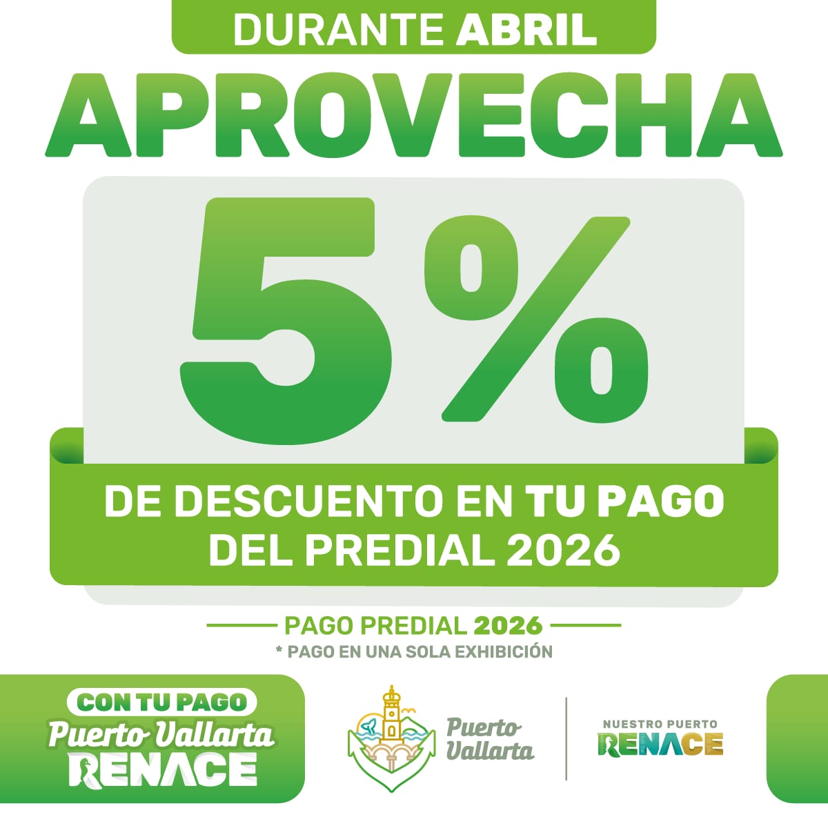 El Gobierno Municipal de Puerto Vallarta, encabezado por el arquitecto Luis Ernesto Munguía González, invita a aprovechar el 5% de descuento en el pago en una sola exhibición del impuesto predial 2026 durante todo el mes de abril.