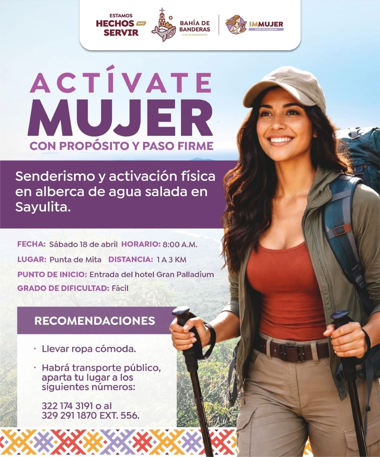 El Gobierno Municipal de Bahía de Banderas, a través del Instituto Municipal de la Mujer, convoca a la actividad “Actívate Mujer: con propósito y paso firme”, una jornada de senderismo y activación física que se llevará a cabo este próximo sábado 18 de abril en el poblado de Punta de Mita.
