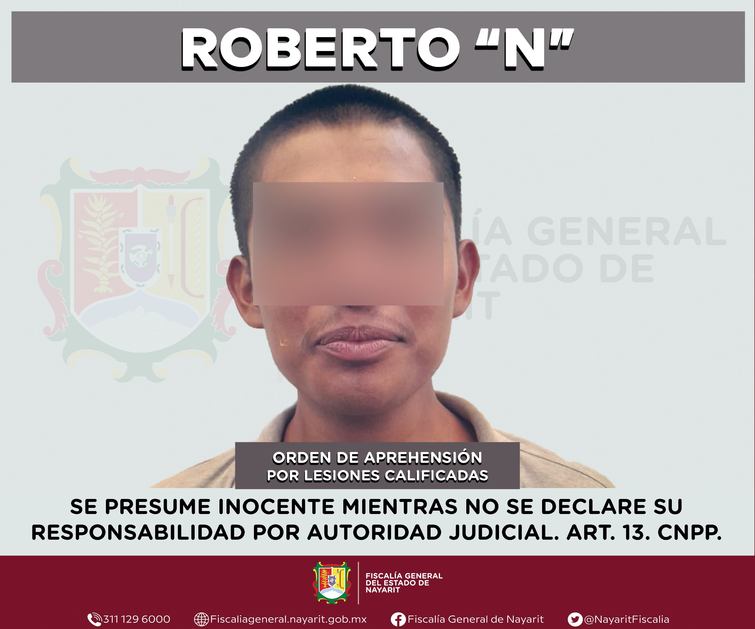 La Fiscalía General del Estado de Nayarit informa que elementos de la Agencia de Investigación Criminal ejecutaron una orden de aprehensión en la ciudad de Tepic en contra de Roberto “N”, por su presunta participación en hechos que la ley tipifica como delito de lesiones calificadas, cometido en agravio de una mujer, cuya identidad se reserva para proteger su privacidad e integridad.