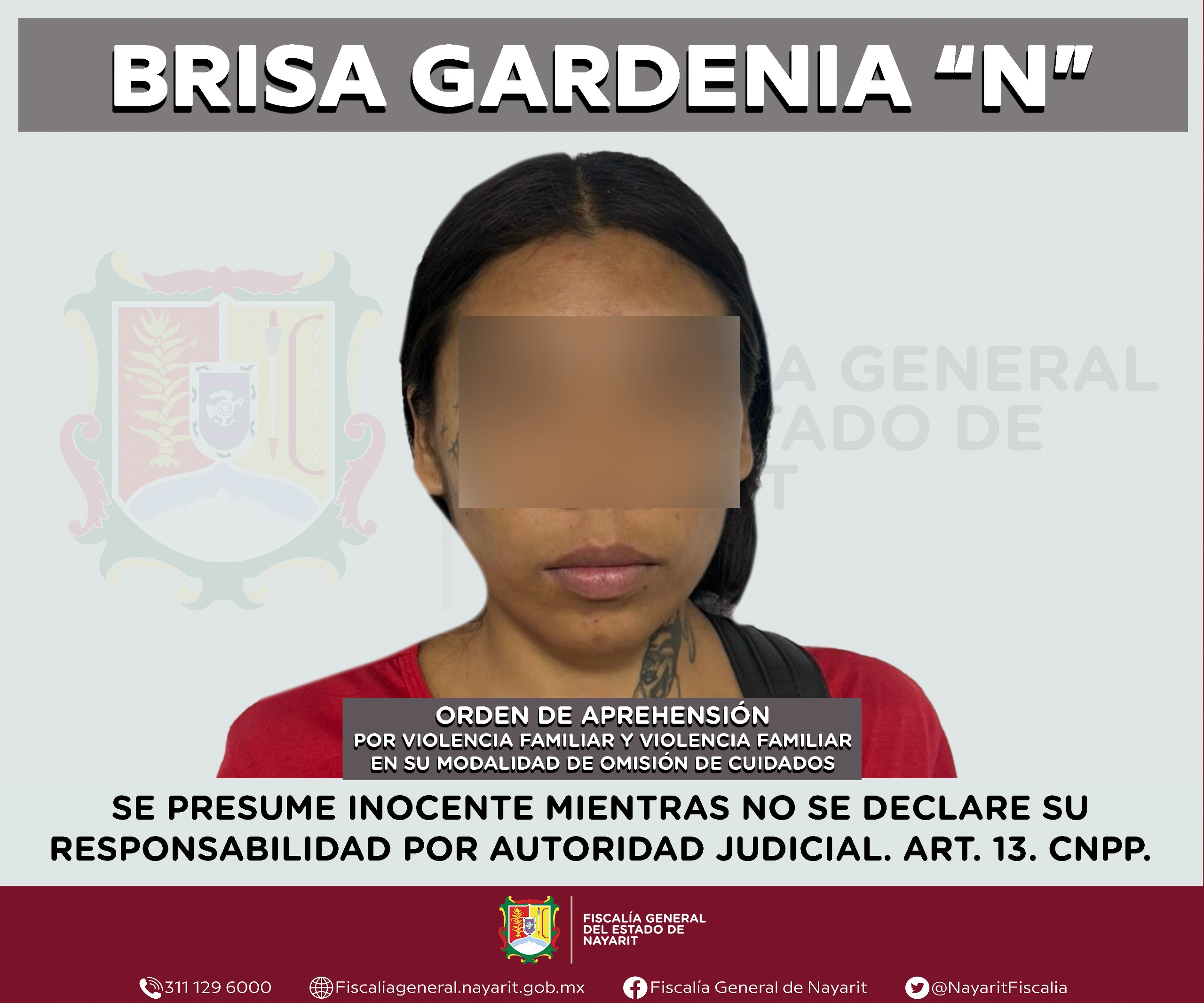 Elementos de la Agencia de Investigación Criminal de Nayarit ejecutaron una orden de aprehensión en la ciudad de Tepic en contra de Brisa Gardenia “N”, por su presunta participación en hechos que la ley tipifica como los delitos de violencia familiar y violencia familiar en su modalidad de omisión de cuidados, cometidos en agravio de una persona del sexo femenino y dos menores de edad, cuyas identidades se reservan para proteger su privacidad e integridad.