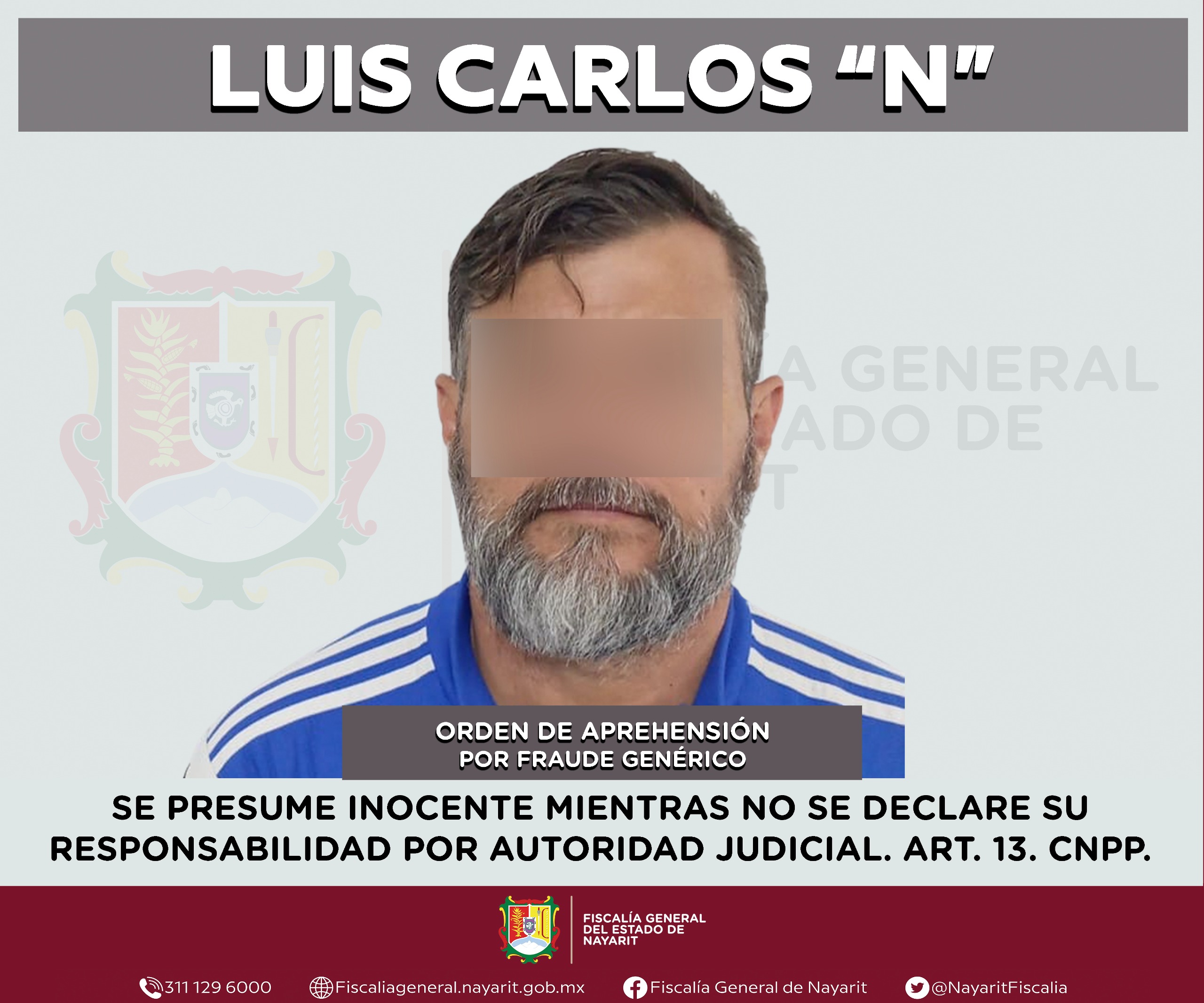 La Fiscalía General del Estado de Nayarit informa que elementos de la Agencia de Investigación Criminal ejecutaron dos órdenes de aprehensión en el municipio de Xalisco en contra de Luis Carlos “N”; la primera por su presunta participación en hechos que la ley tipifica como delito de fraude específico, cometido en agravio de dos personas —una del sexo masculino y otra del sexo femenino—, cuyas identidades se reservan para proteger su privacidad e integridad. En tanto, la segunda orden de aprehensión se ejecutó por su probable responsabilidad en hechos que la ley señala como delito de fraude genérico, en agravio de una empresa privada.